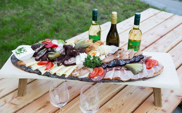 Heurigenjause: Bratl, geselchte Ripperl, verschiedene Käse, Speck, kleine Schnitzerl, versch. Aufstriche, reichlich Garnitur Preis/Person 10,50 inkl. Brot